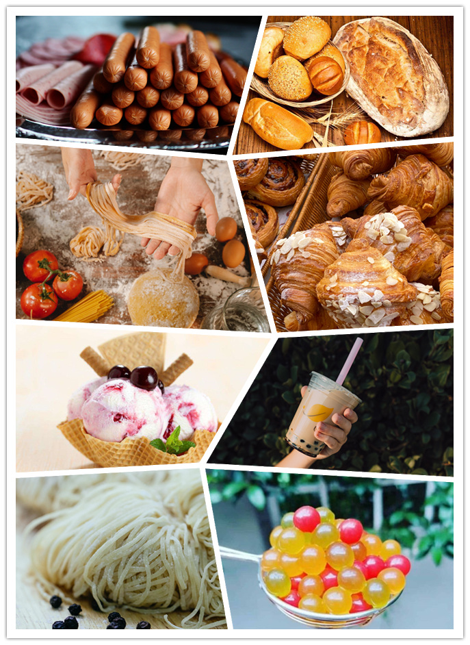 Food grade sodium alginate is mainly used in food, adhesives, stabilizers and molding agents. In food, it is mainly used for imitation food, pasta, beverage, meat products, stuffing, jam, pet food, etc.