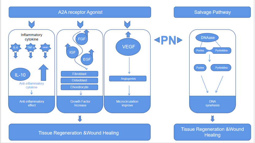 PN (SALMON POLYNUCLEOTIDE) - salmon polynucleotide, a chain polymer composed of many nucleotides, is a high-purity precise molecule extracted and separated from salmon testes (semen) through a domestic patent that has been developed. Its effect and safety have been certified through years of clinical research.